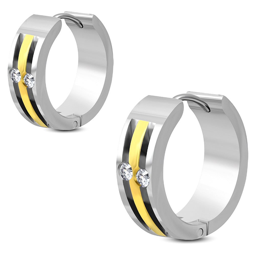 7mm | Stainless Steel 2-tone Cutout Hoop Huggie Earrings w/ Clear CZ (pair)